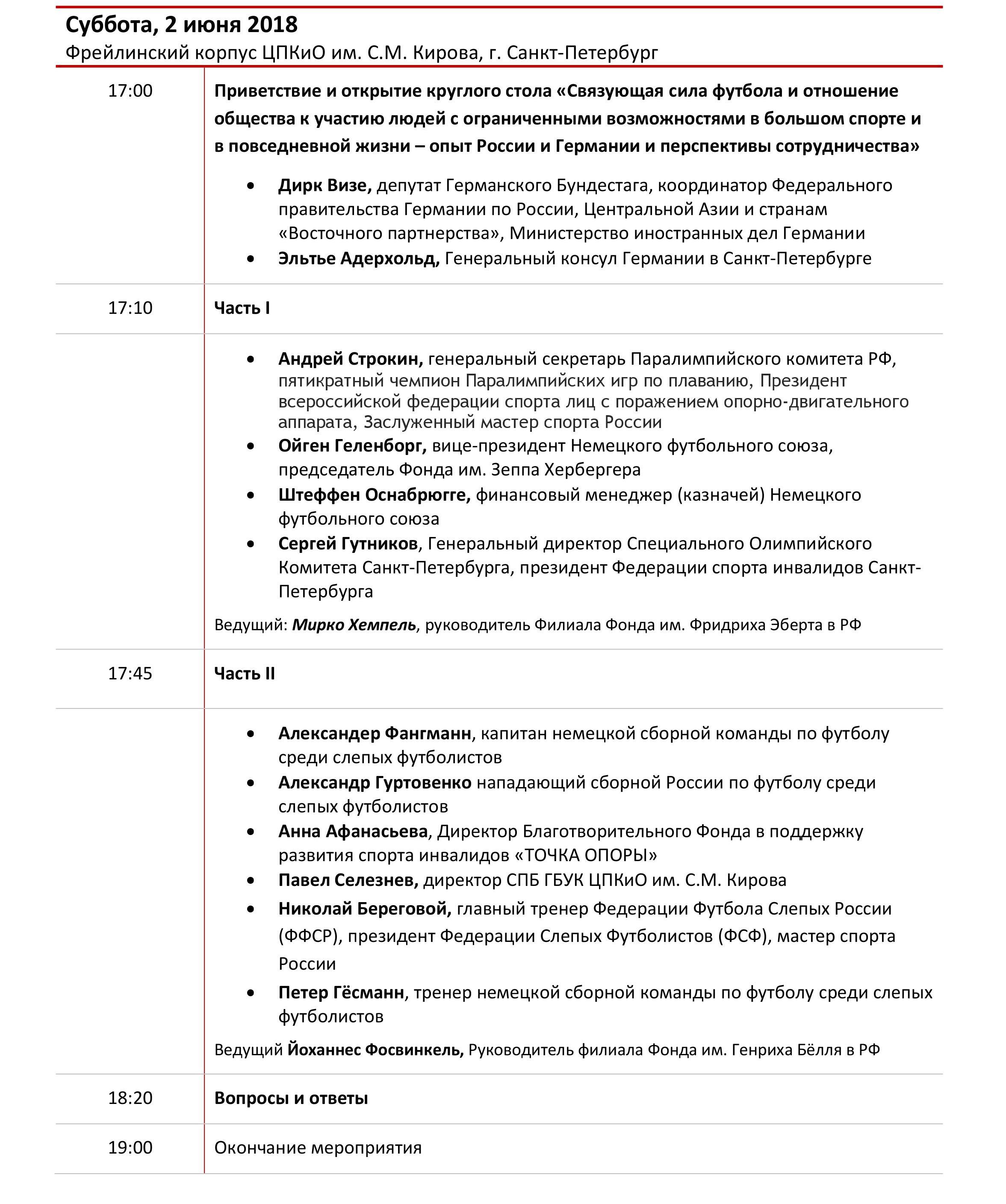 2 июня, с 17:00 до 19:00 в Красном зале Конюшенного корпуса ЦПКиО им. С. М. Кирова пройдут дискуссии с участием зарубежных и российских экспертов в области паралимпийского спорта и футбола, а также директора Благотворительного фонда в поддержку развития спорта инвалидов «ТОЧКА ОПОРЫ» Анны Афанасьевой.